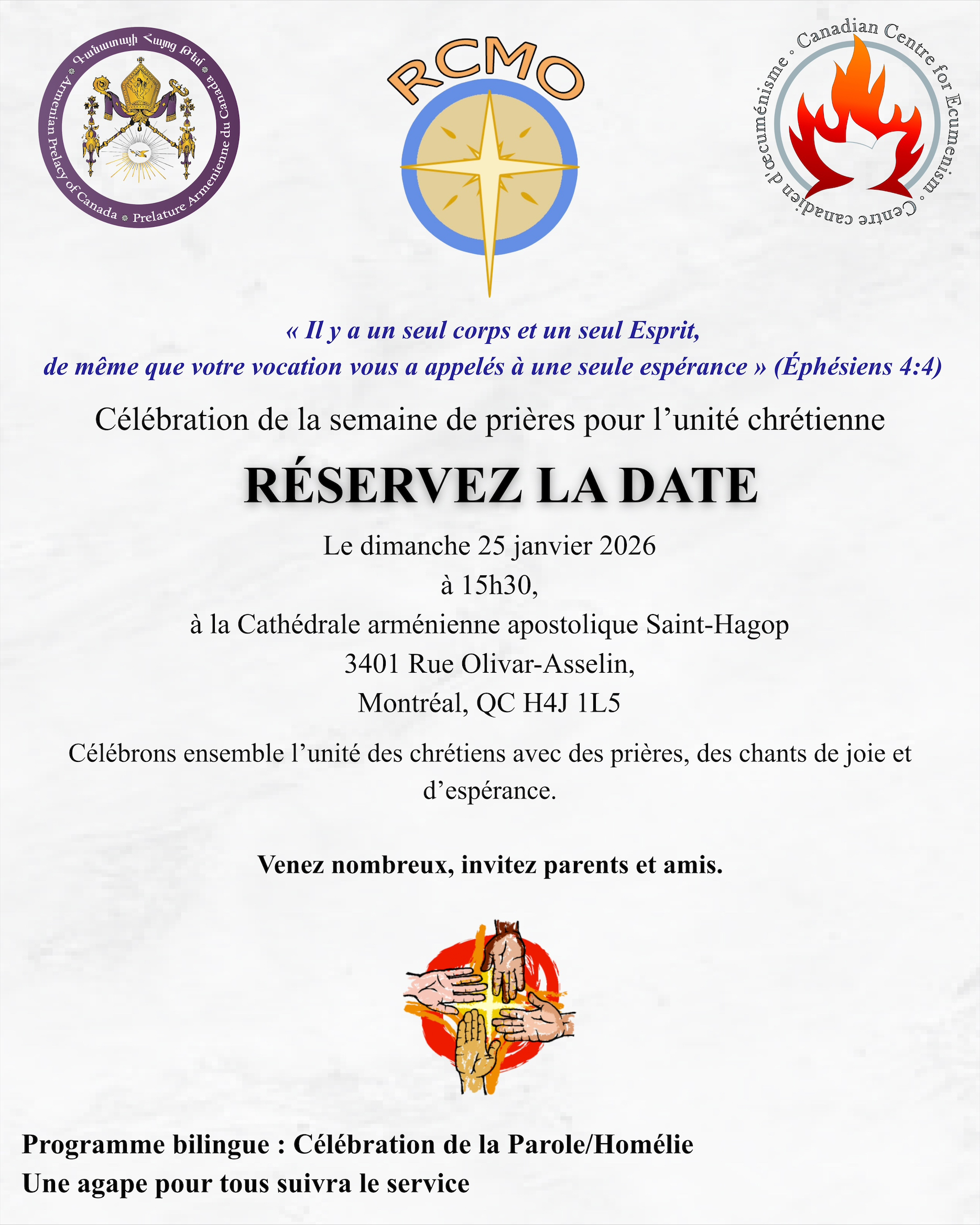 Célébrons ensemble l’unité des chrétiens avec des prières, des chants de joie et d’espérance. Venez nombreux; invitez parents et amis.